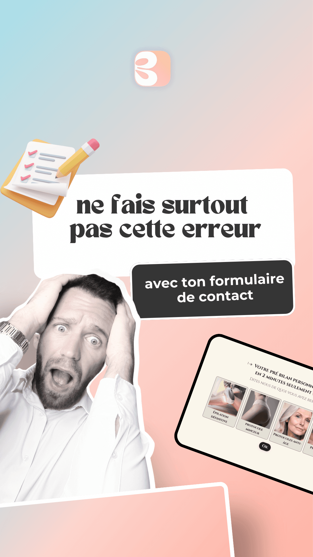 Ces formulaires personnalisent l’expérience, ce qui est essentiel dans le secteur esthétique où chaque client a des besoins uniques. 🎯 Plutôt que de se retrouver face à un formulaire ennuyeux et standardisé, le visiteur est guidé à travers une série de questions interactives et pertinentes, ce qui augmente ses chances de prendre rendez-vous.